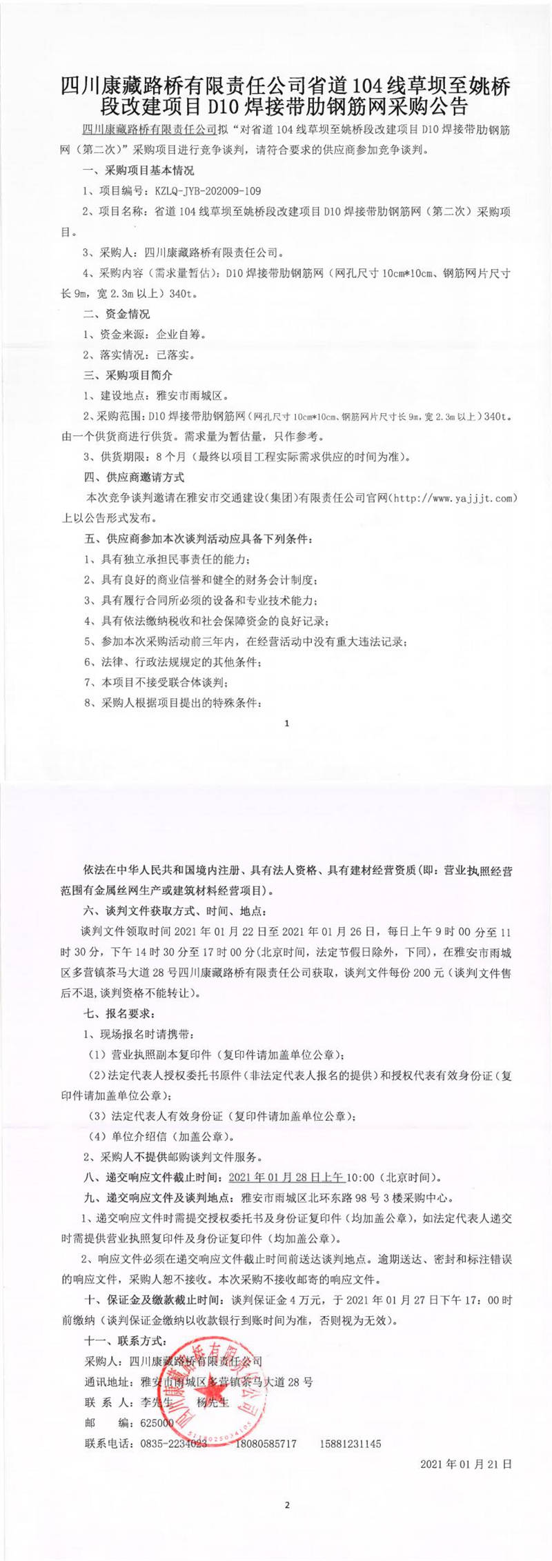 四川康藏路橋有限責(zé)任公司省道104線草壩至姚橋段改建項(xiàng)目D10焊接帶肋鋼筋網(wǎng)(第二次)采購(gòu)公告