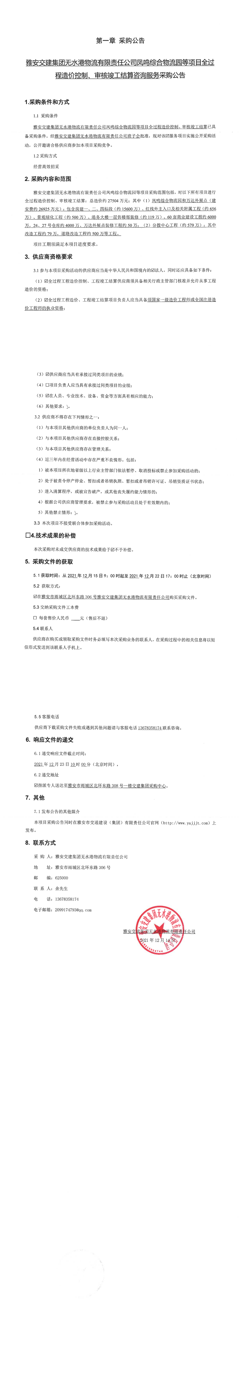 雅安交建集團(tuán)無水港物流有限責(zé)任公司鳳鳴綜合物流等項(xiàng)目全過程造價控制、審核竣工結(jié)算咨詢服務(wù)采購公告