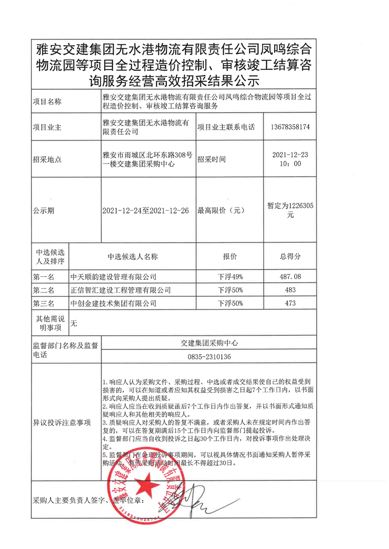 雅安交建集團(tuán)無水港物流有限責(zé)任公司鳳鳴綜合物流等項(xiàng)目全過程造價(jià)控制、審核竣工結(jié)算咨詢服務(wù)經(jīng)營高效招采結(jié)果公示