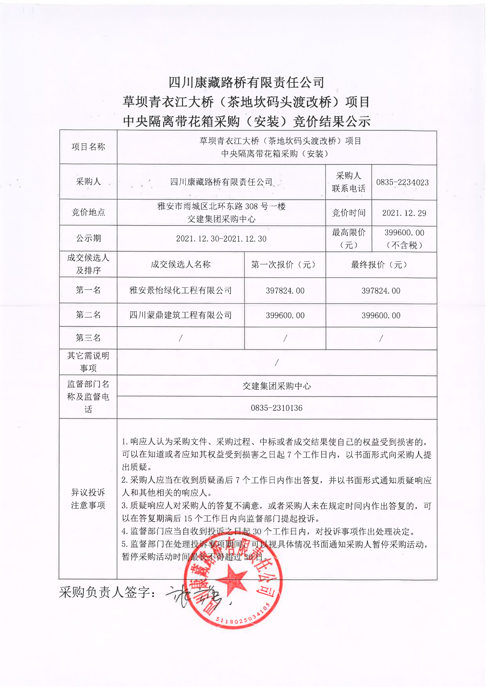 四川康藏路橋有限責任公司草壩青衣江大橋(茶地坎碼頭渡改橋)項目中央隔離帶花箱采購(安裝)競價結果公示