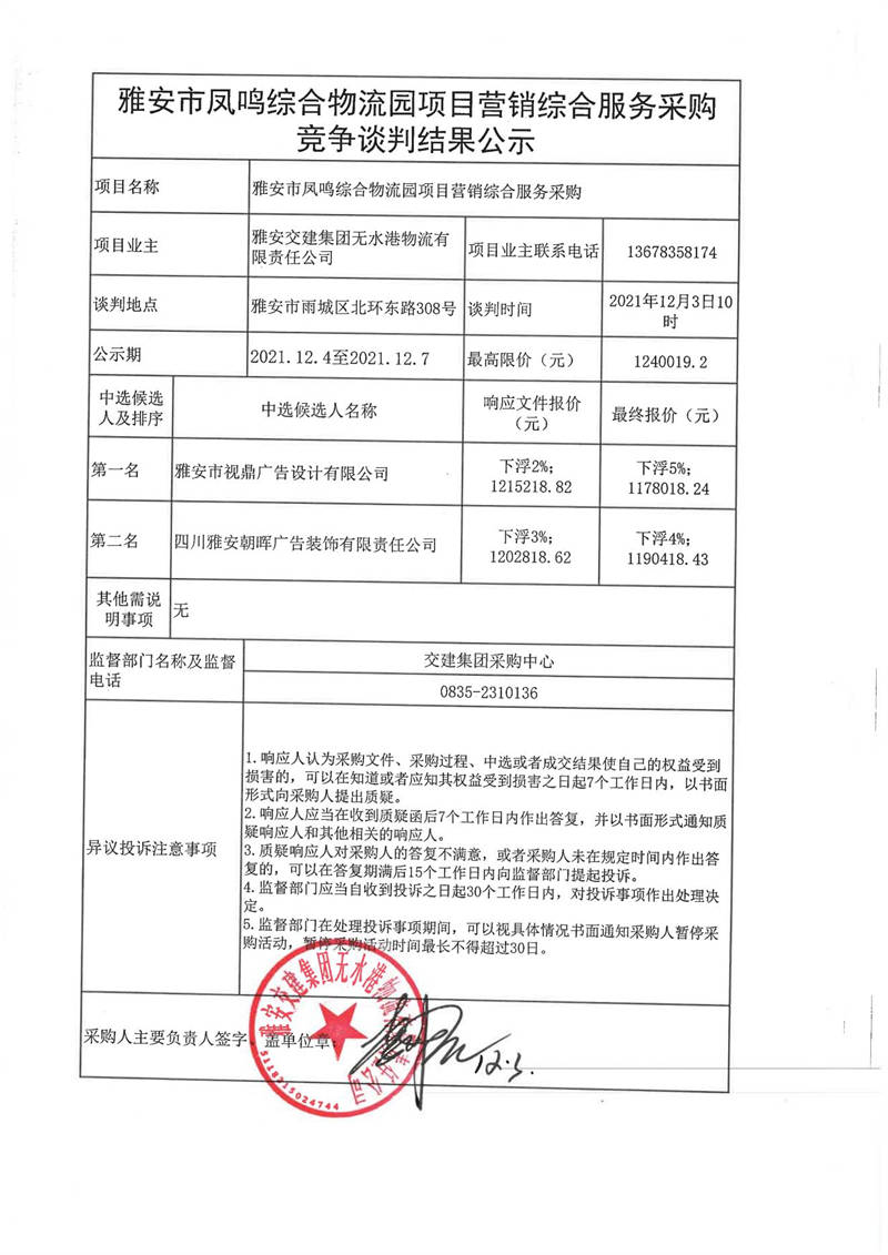 雅安交建集團(tuán)無(wú)水港物流有限責(zé)任公司雅安市鳳鳴綜合物流園項(xiàng)目營(yíng)銷(xiāo)綜合服務(wù)采購(gòu)競(jìng)爭(zhēng)談判結(jié)果公示
