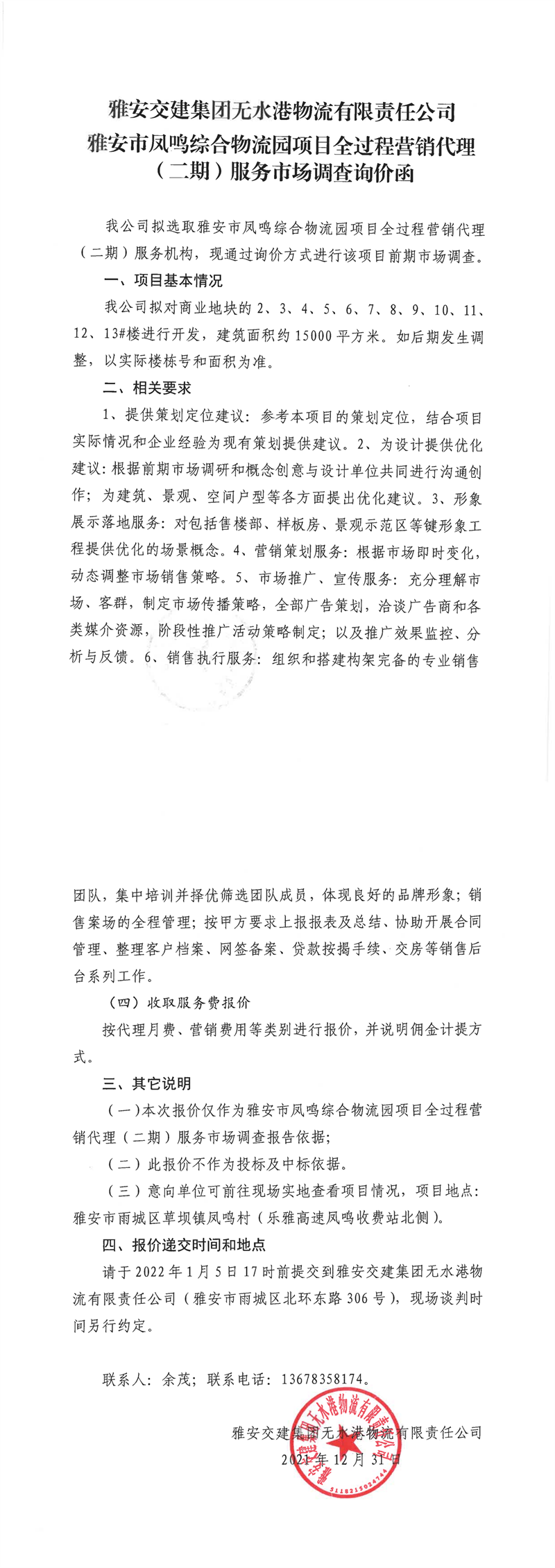 雅安交建集團(tuán)無水港物流有限責(zé)任公司雅安市鳳鳴綜合物流園項(xiàng)目全過程營(yíng)銷代理(二期)服務(wù)市場(chǎng)調(diào)查詢價(jià)函