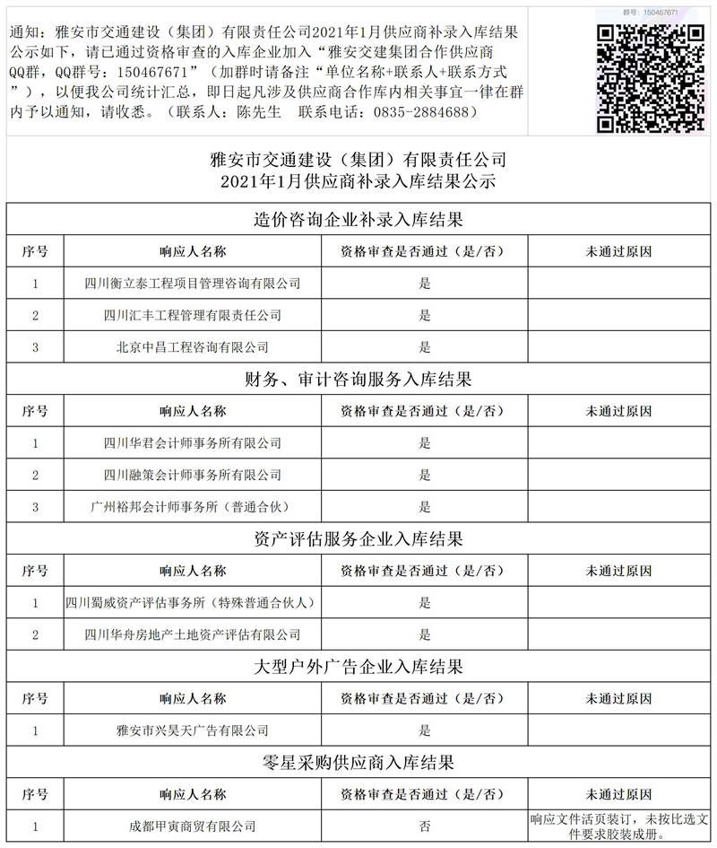 雅安市交通建設(shè)(集團(tuán))有限責(zé)任公司2021年1月供應(yīng)商補(bǔ)錄入庫(kù)結(jié)果公示