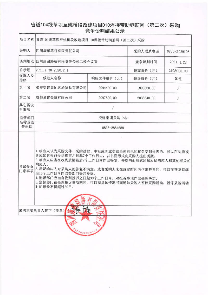 四川康藏路橋有限責任公司省道104線草壩至姚橋段改建項目D10焊接帶肋鋼筋網(wǎng)(第二次)采購競爭談判結果公示