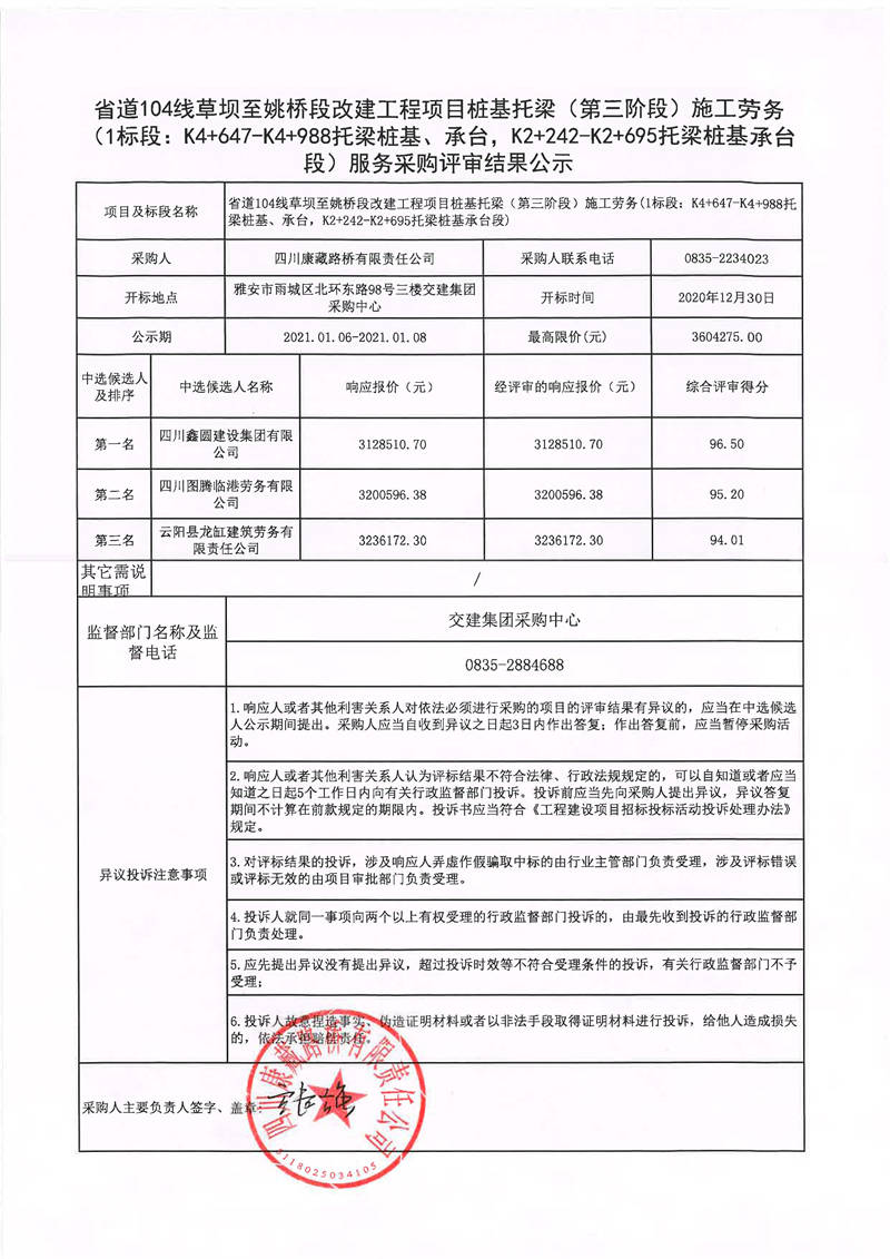 四川康藏路橋有限責任公司省道104線草壩至姚橋段改建工程項目樁基托梁(第三階段)施工勞務服務1標段采購評審結(jié)果公示