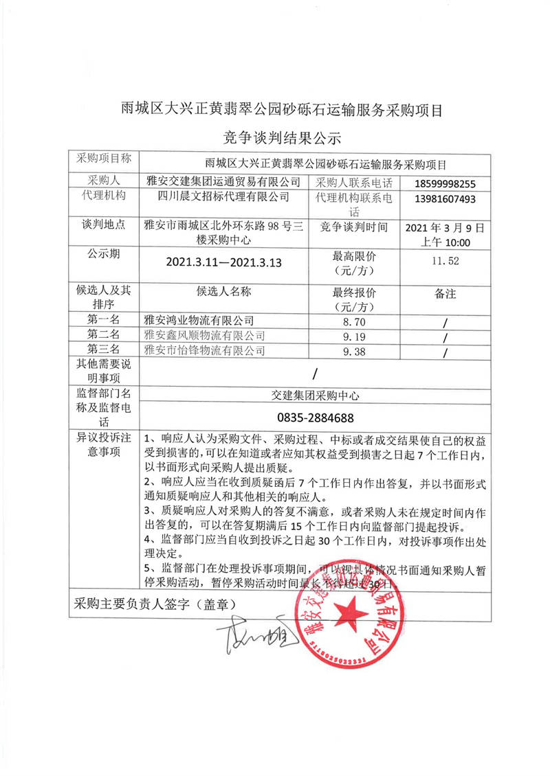 雅安交建集團(tuán)運(yùn)通貿(mào)易有限公司雨城區(qū)大興正黃翡翠公園砂礫石運(yùn)輸服務(wù)采購(gòu)項(xiàng)目競(jìng)爭(zhēng)談判結(jié)果公示