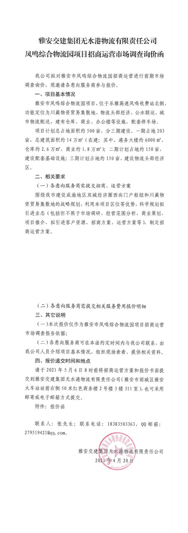 雅安交建集團(tuán)無(wú)水港物流有限責(zé)任公司雅安市鳳鳴綜合物流園項(xiàng)目招商運(yùn)營(yíng)市場(chǎng)調(diào)查詢(xún)價(jià)函