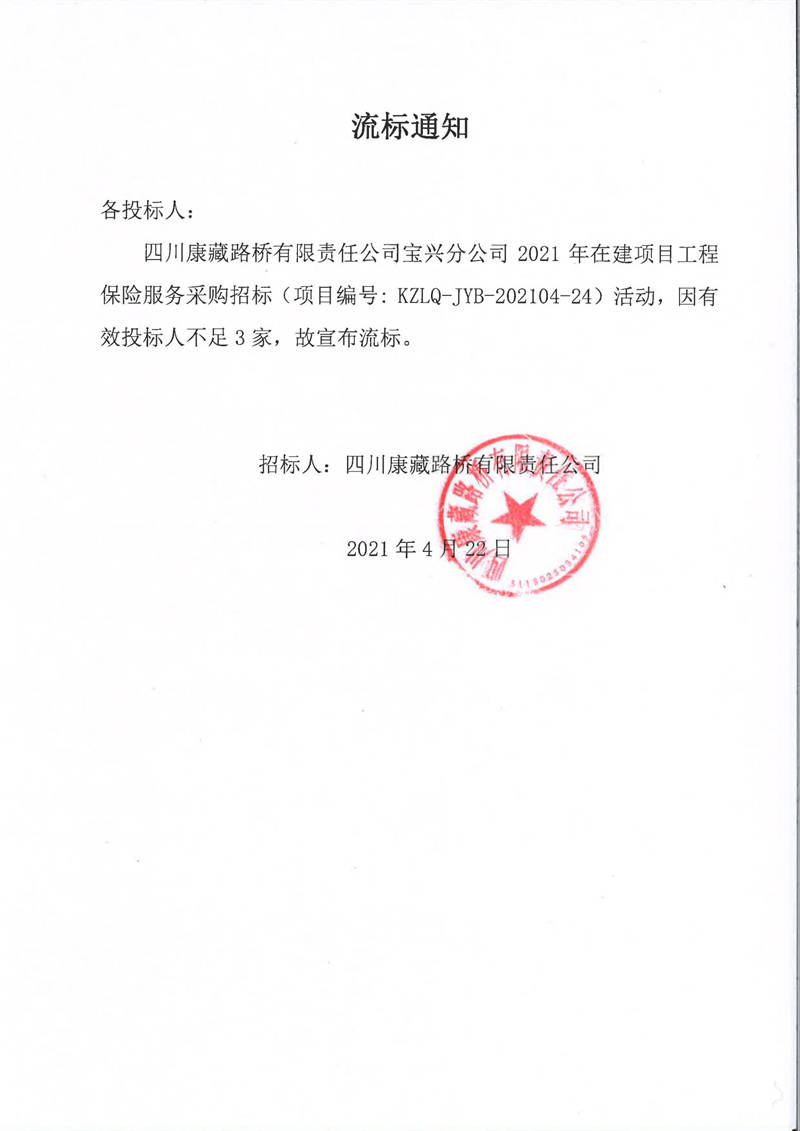 四川康藏路橋有限責(zé)任公司寶興分公司2021年在建項(xiàng)目工程保險服務(wù)采購流標(biāo)通知