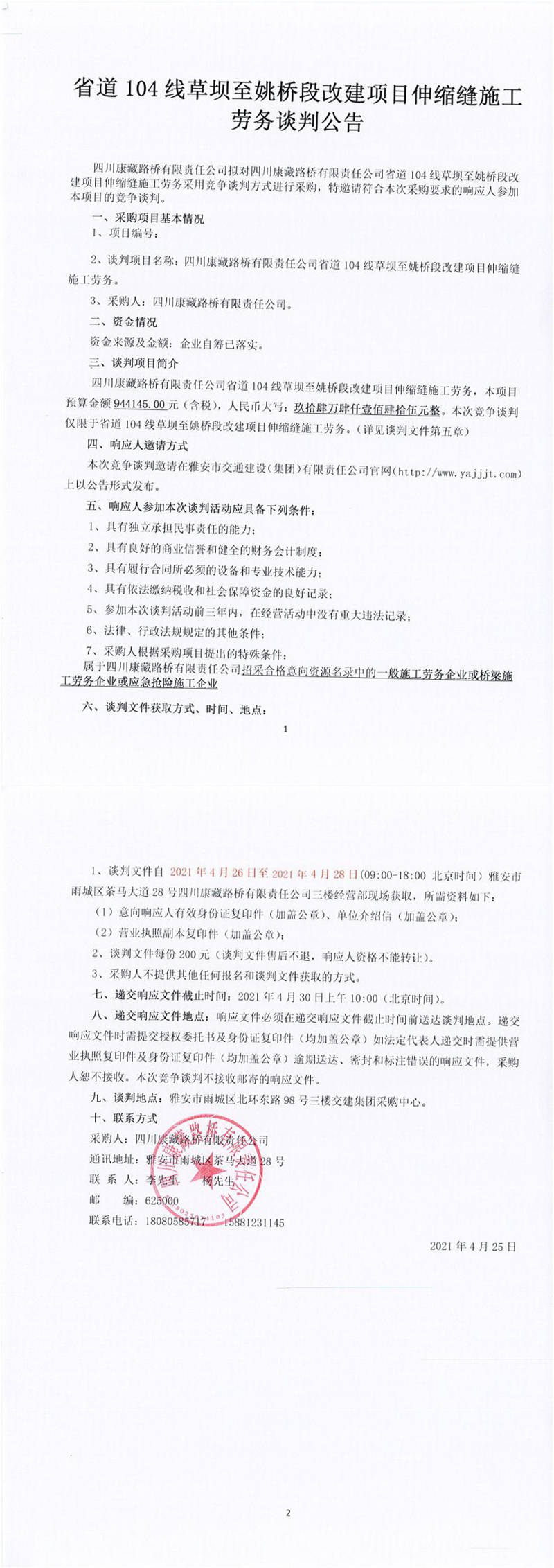 四川康藏路橋有限責任公司省道104線草壩至姚橋段改建項目伸縮縫施工勞務談判公告