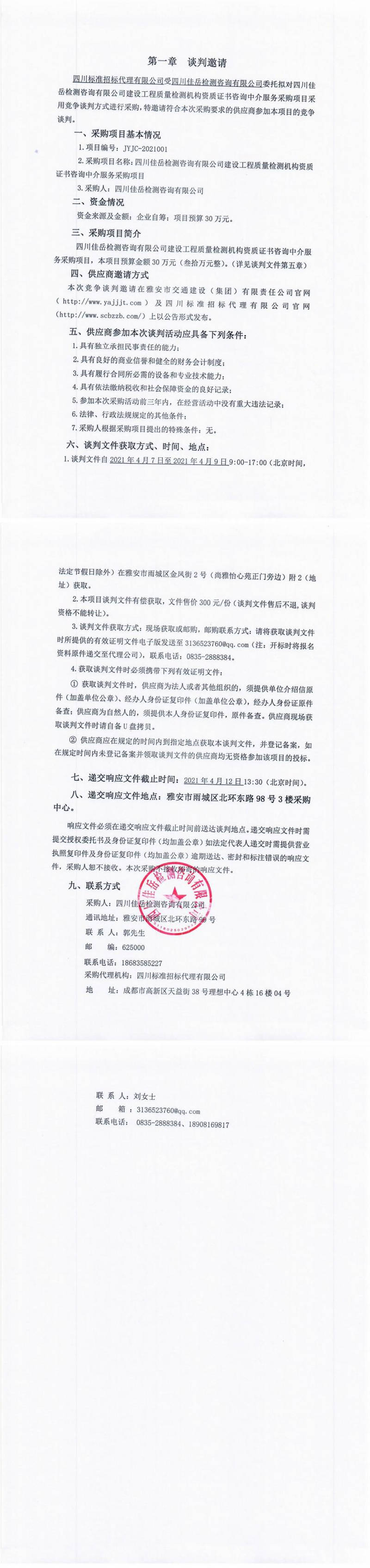 四川佳岳檢測(cè)咨詢有限公司建設(shè)工程質(zhì)量檢測(cè)機(jī)構(gòu)資質(zhì)證書(shū)咨詢中介服務(wù)采購(gòu)項(xiàng)目競(jìng)爭(zhēng)談判公告