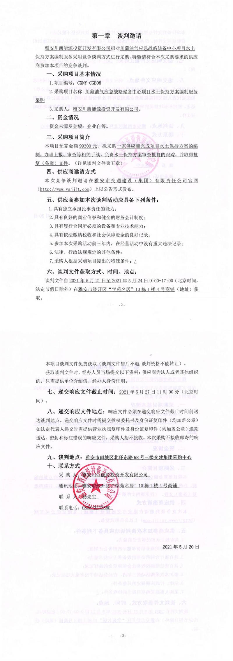 雅安川西能源投資開發(fā)有限公司川藏油氣應急戰(zhàn)略儲備中心項目水土保持方案編制服務采購競爭談判公告