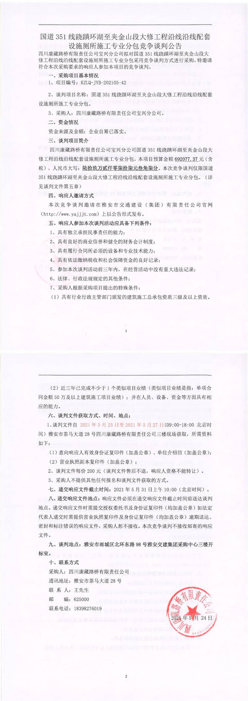 四川康藏路橋有限責(zé)任公司寶興分公司國(guó)道351線蹺磧環(huán)湖至夾金山段大修工程沿線沿線配套設(shè)施廁所施工專(zhuān)業(yè)分包競(jìng)爭(zhēng)談判公告