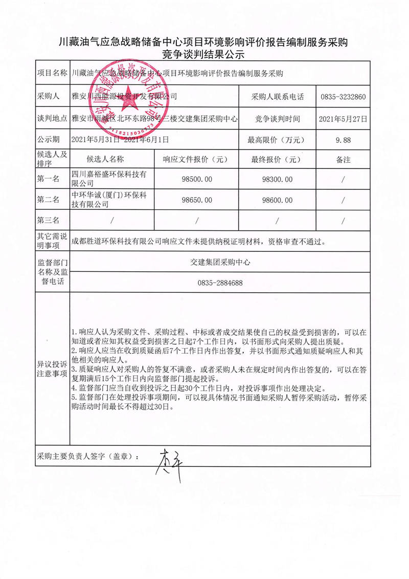 雅安川西能源投資開發(fā)有限公司川藏油氣應(yīng)急戰(zhàn)略儲(chǔ)備中心項(xiàng)目環(huán)境影響評(píng)價(jià)報(bào)告編制服務(wù)采購競(jìng)爭(zhēng)性談判結(jié)果公示