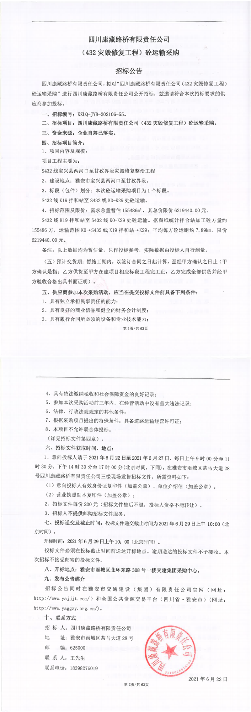 四川康藏路橋有限責(zé)任公司(432災(zāi)毀修復(fù)工程)砼運輸采購招標(biāo)公告