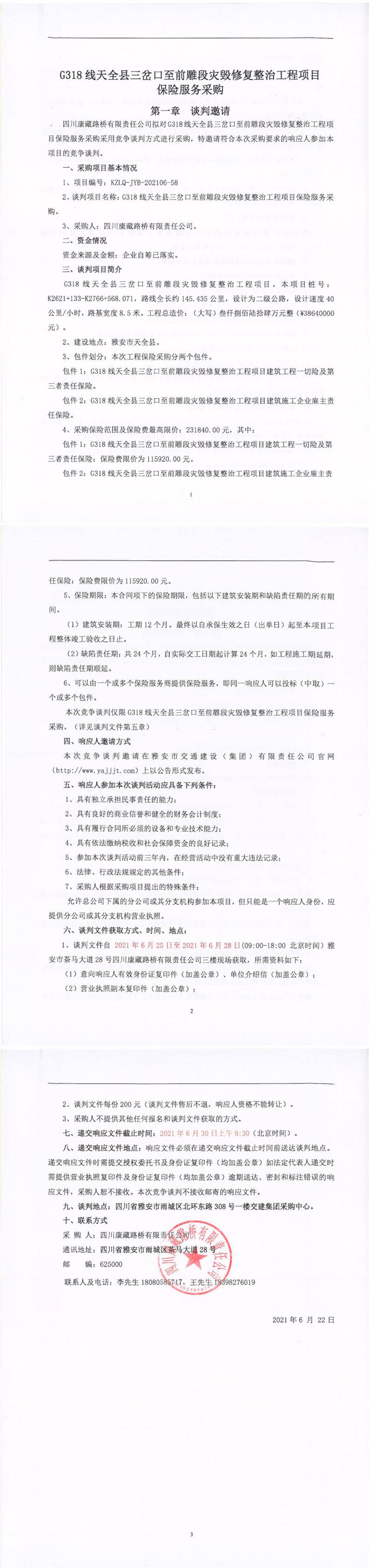 四川康藏路橋有限責(zé)任公司G318線天全縣三岔口至前雕段災(zāi)毀修復(fù)整治工程項(xiàng)目保險(xiǎn)服務(wù)采購競爭談判公告