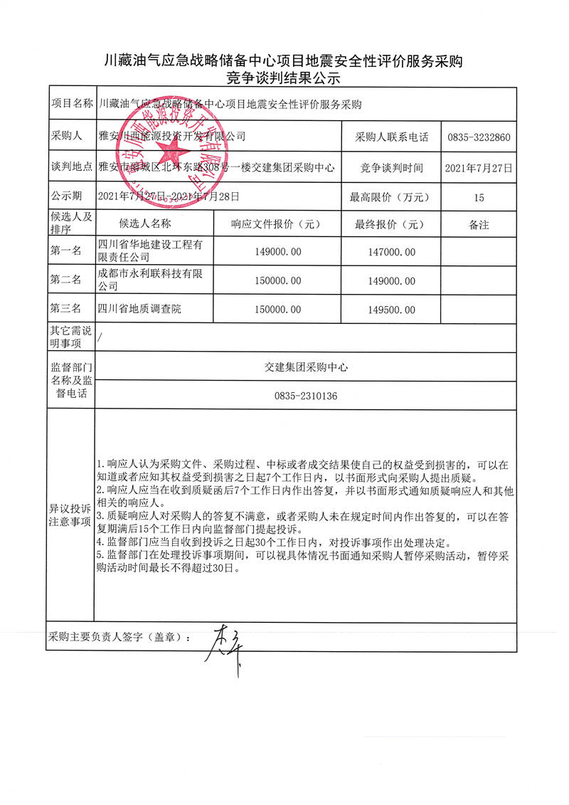 雅安川西能源投資開發(fā)有限公司川藏油氣應(yīng)急戰(zhàn)略儲(chǔ)備中心項(xiàng)目地震安全性評(píng)價(jià)服務(wù)采購競爭談判結(jié)果公示