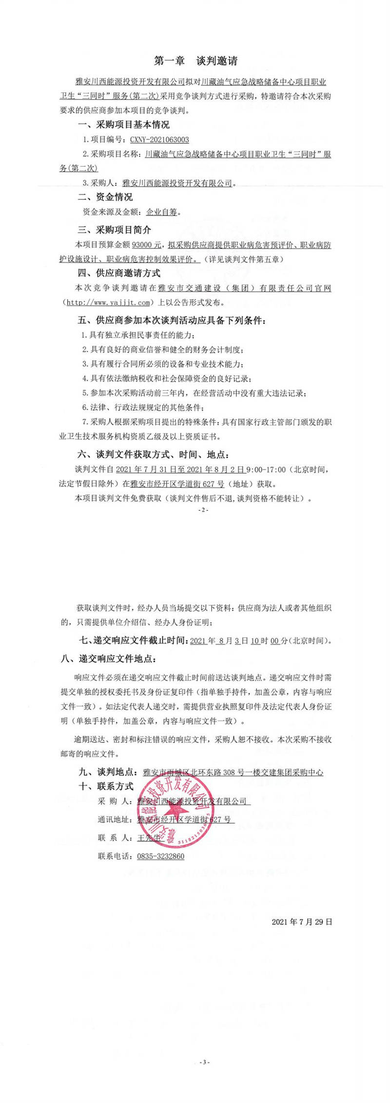 雅安川西能源投資開發(fā)有限公司川藏油氣應(yīng)急戰(zhàn)略儲(chǔ)備中心項(xiàng)目職業(yè)衛(wèi)生“三同時(shí)”服務(wù)(第二次)競爭談判公告