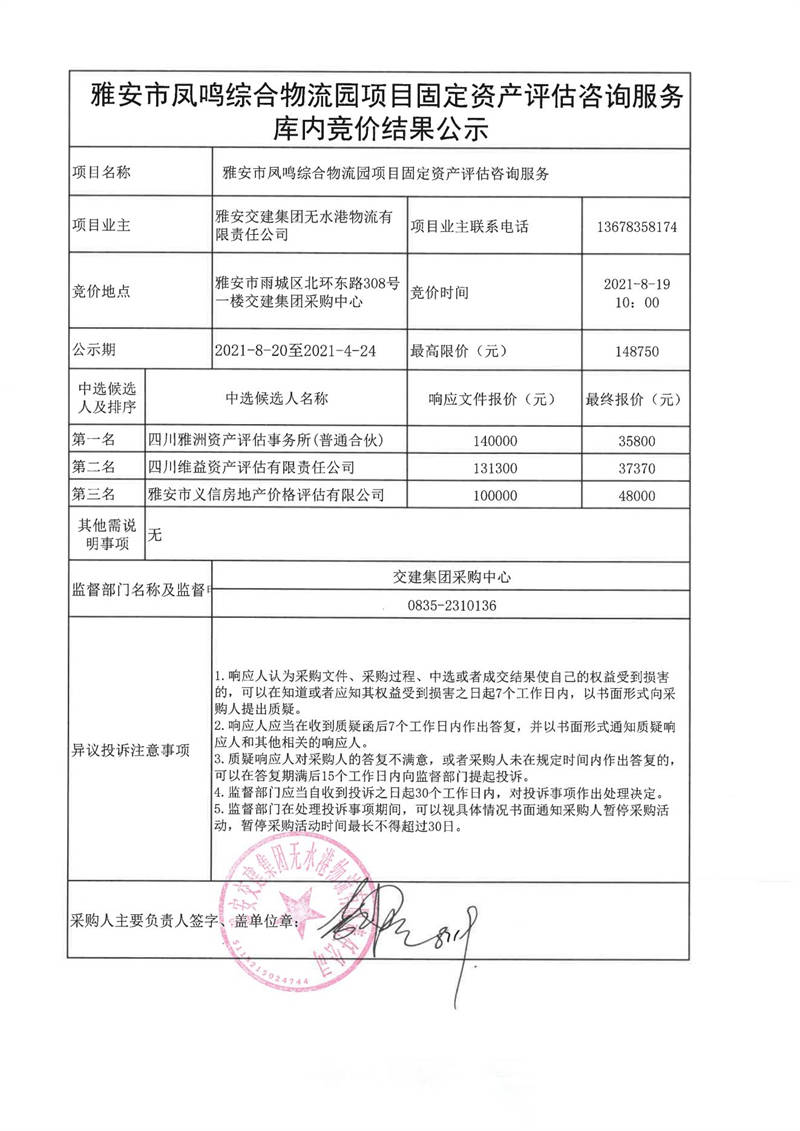 雅安交建集團無水港物流有限責(zé)任公司雅安市鳳鳴綜合物流園項目固定資產(chǎn)評估咨詢服務(wù)庫內(nèi)競價結(jié)果公示