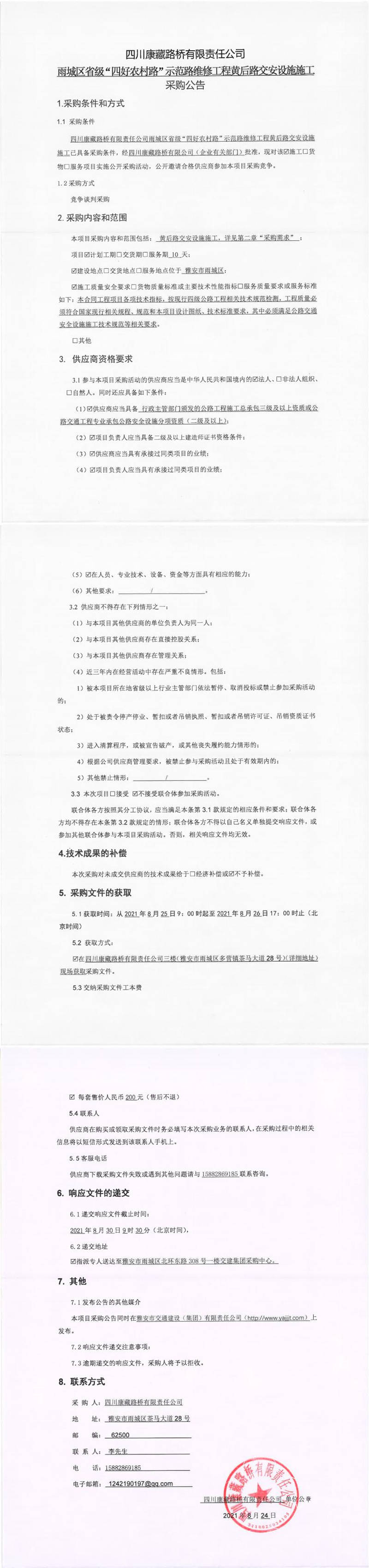四川康藏路橋有限責(zé)任公司雨城區(qū)省級“四好農(nóng)村路”示范路維修工程黃后路交安設(shè)施施工采購公告