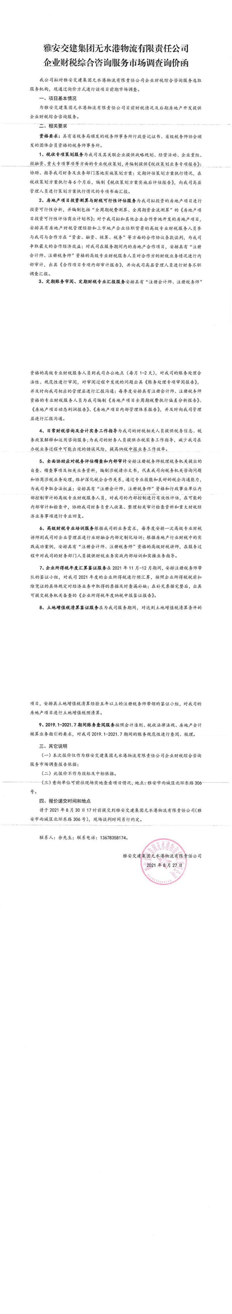雅安交建集團(tuán)無水港物流有限責(zé)任公司企業(yè)財(cái)稅綜合咨詢服務(wù)市場調(diào)查詢價(jià)函
