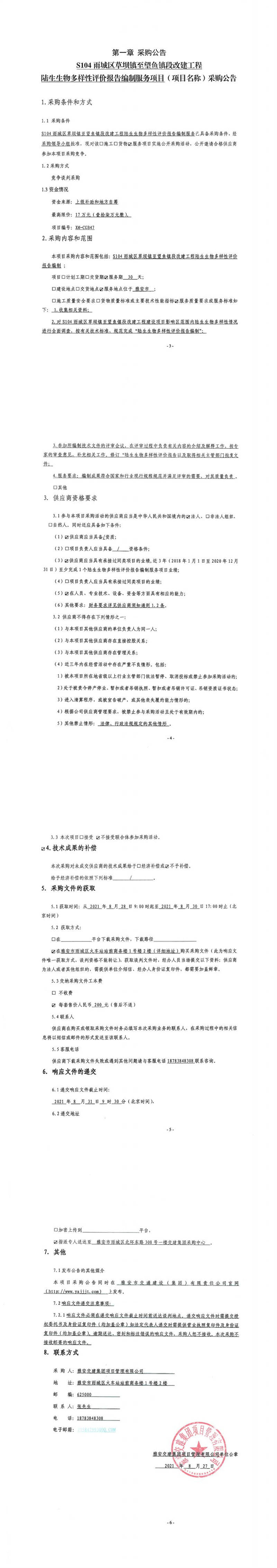 雅安交建集團項目管理有限公司S104雨城區(qū)草壩鎮(zhèn)至望魚鎮(zhèn)段改建工程陸生生物多樣性評價報告編制服務項目采購公告