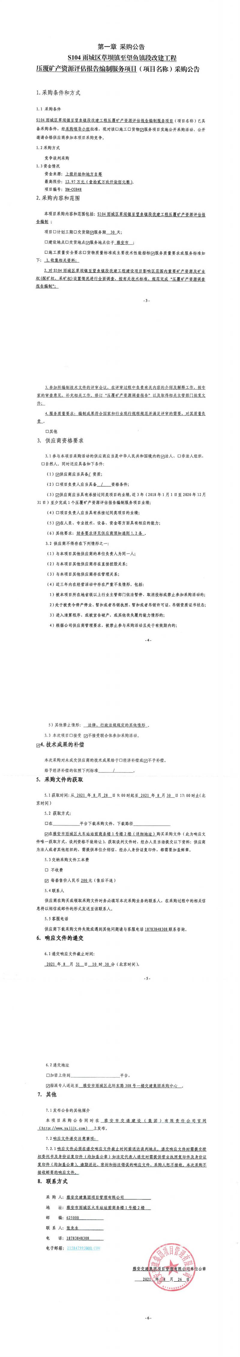 雅安交建集團(tuán)項目管理有限公司S104雨城區(qū)草壩鎮(zhèn)至望魚鎮(zhèn)段改建工程壓覆礦產(chǎn)資源評估報告編制服務(wù)項目采購公告