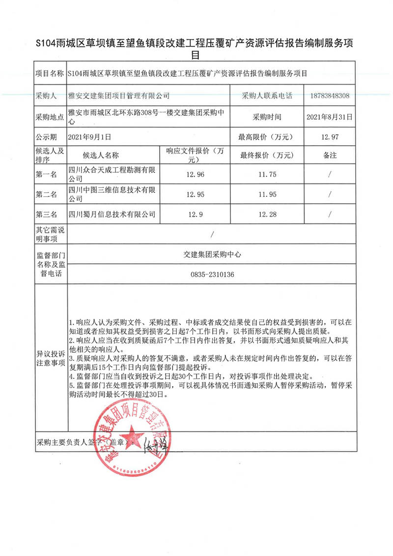 雅安交建集團(tuán)項(xiàng)目管理有限公司S104雨城區(qū)草壩鎮(zhèn)至望魚鎮(zhèn)段改建工程壓覆礦產(chǎn)資源評(píng)估報(bào)告編制服務(wù)項(xiàng)目評(píng)審結(jié)果公示