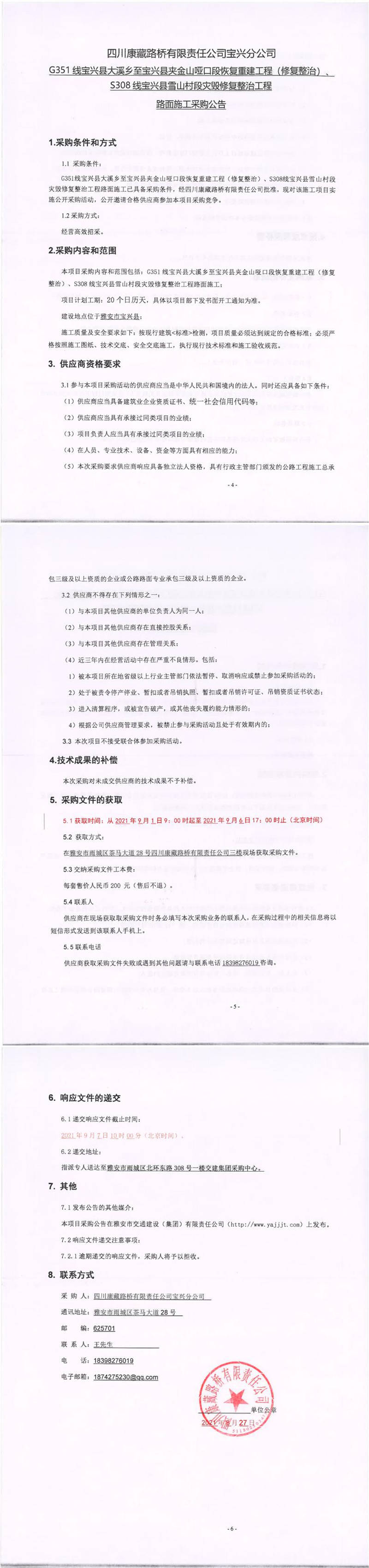 四川康藏路橋有限責任公司寶興分公司G351線寶興縣大溪鄉(xiāng)至寶興縣夾金山啞口段恢復重建工程(修復整治)、S308線寶興縣雪山村段災毀修復整治工程路面施工采購公告