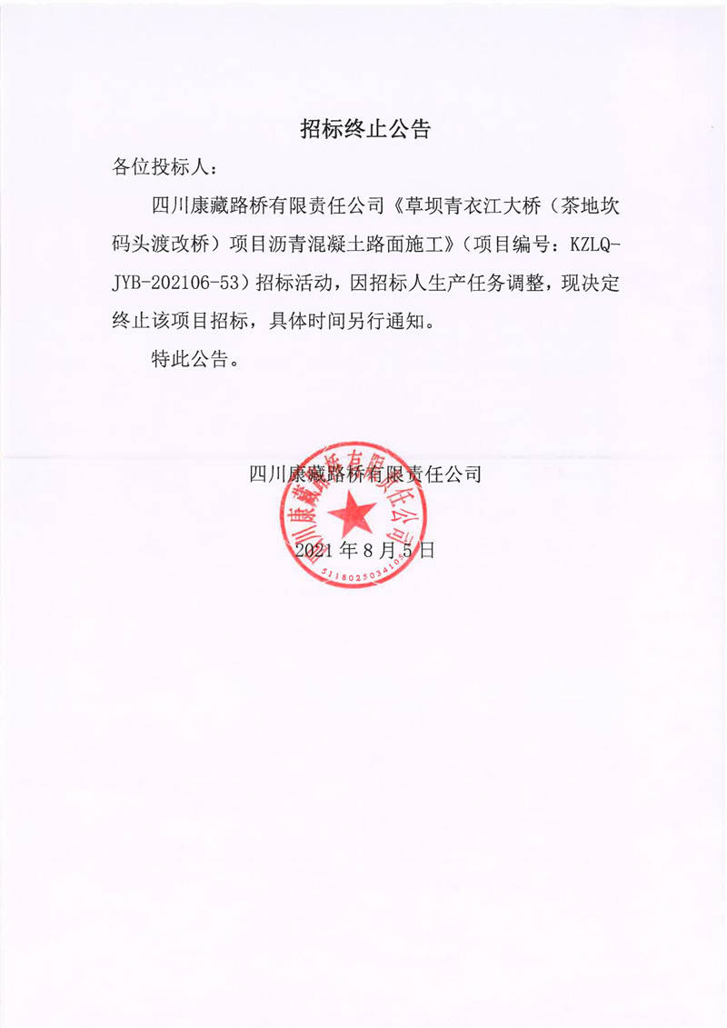 四川康藏路橋有限責(zé)任公司草壩青衣江大橋(茶地坎碼頭渡改橋)項目瀝青混凝土路面施工招標(biāo)終止公告
