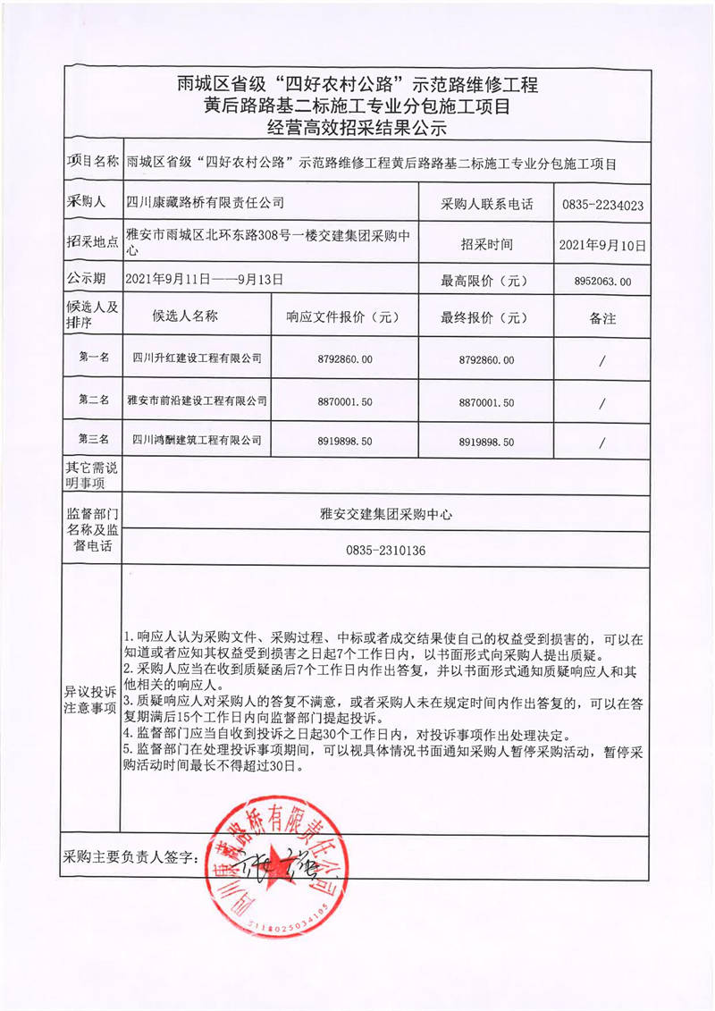 四川康藏路橋有限責任公司雨城區(qū)省級“四好農(nóng)村公路”示范路維修工程黃后路路基二標施工專業(yè)分包施工項目經(jīng)營高效招采結(jié)果公示