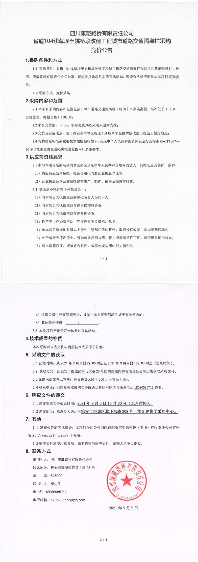 四川康藏路橋有限責任公司省道104線草壩至姚橋段改建工程城市道路交通隔離欄采購競價公告