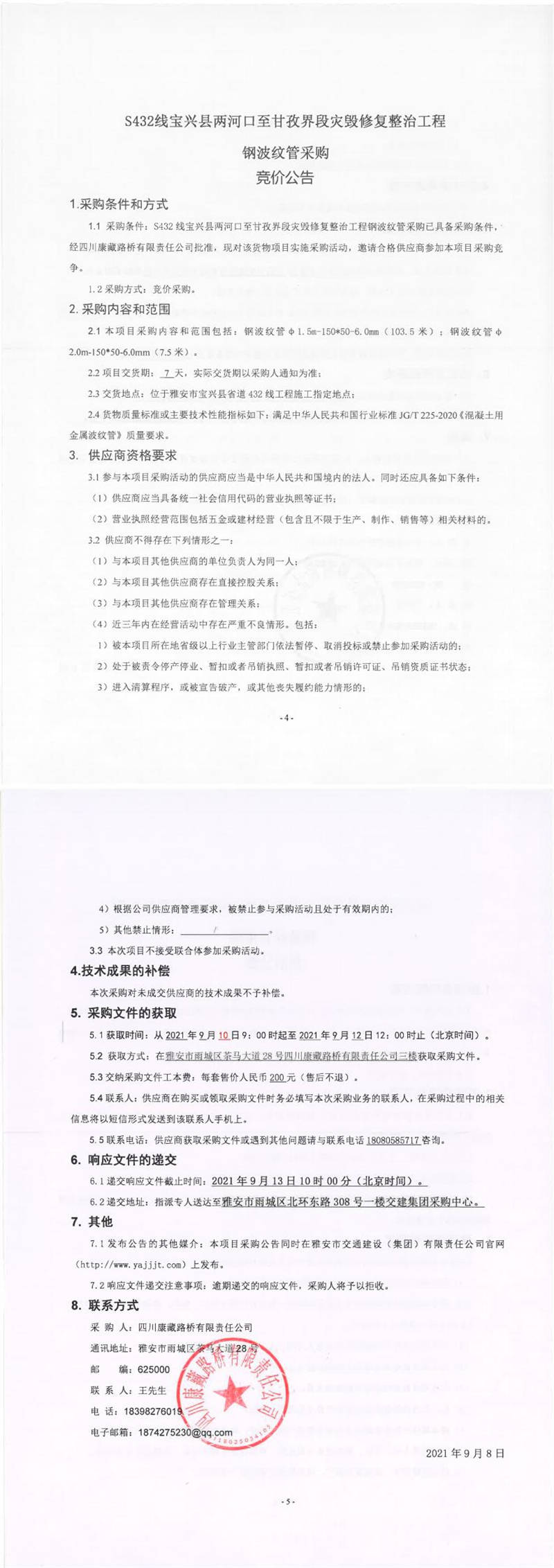 四川康藏路橋有限責(zé)任公司S432線寶興縣兩河口至甘孜界段災(zāi)毀修復(fù)整治工程鋼波紋管采購競價(jià)公告