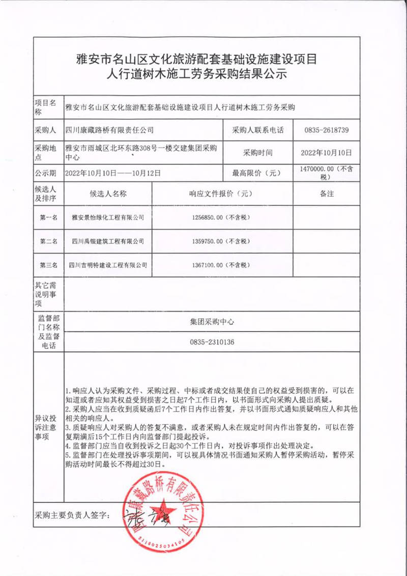 四川康藏路橋有限責(zé)任公司雅安市名山區(qū)文化旅游配套基礎(chǔ)設(shè)施建設(shè)項(xiàng)目人行道樹(shù)木施工勞務(wù)采購(gòu)結(jié)果公示