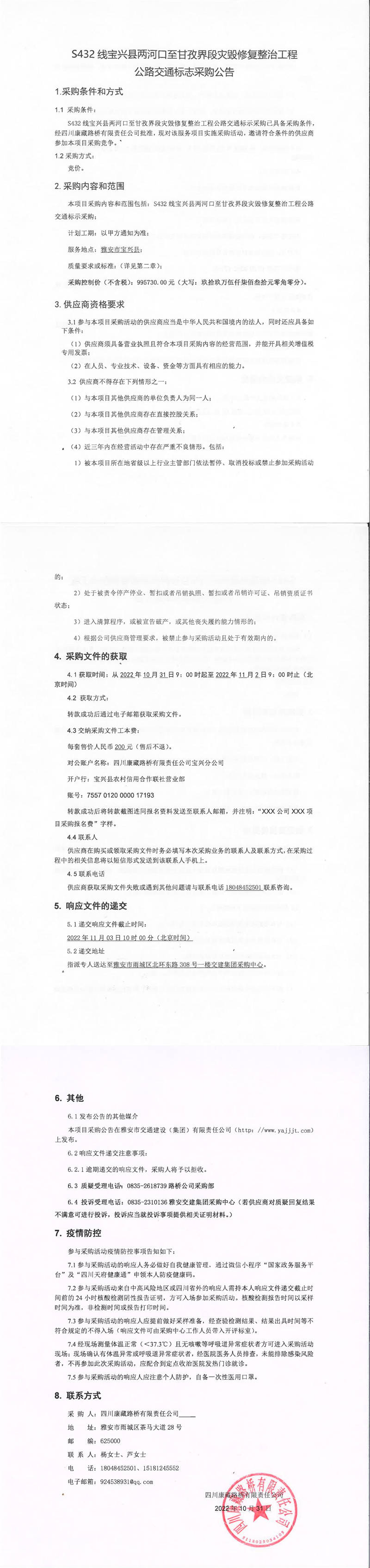 四川康藏路橋有限責任公司S432線寶興縣兩河口至甘孜界段災(zāi)毀修復(fù)整治工程公路交通標志采購公告