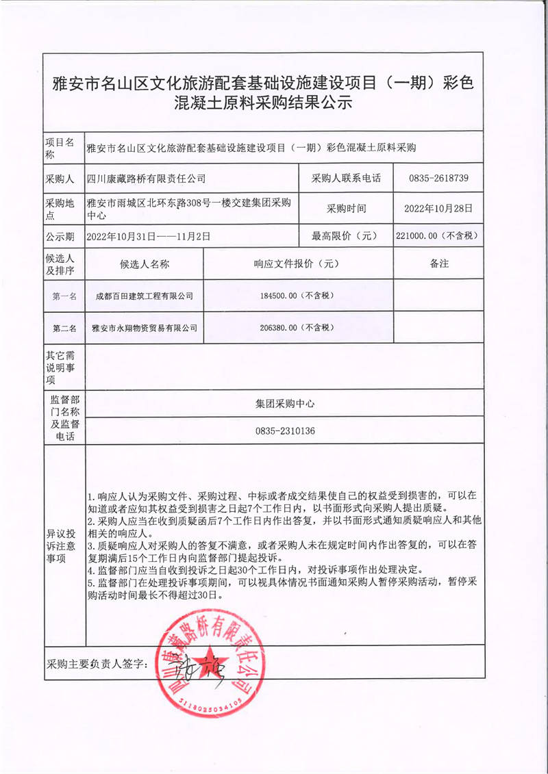四川康藏路橋有限責任公司雅安市名山區(qū)文化旅游配套基礎(chǔ)設(shè)施建設(shè)項目(一期)彩色混凝土原料采購結(jié)果公示