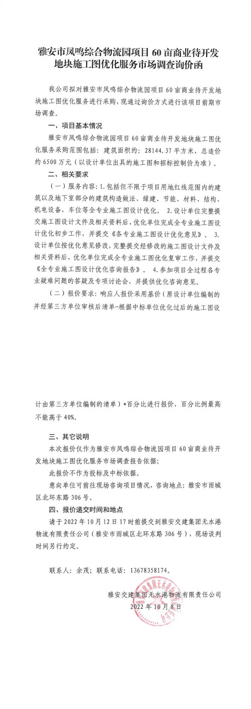 雅安交建集團(tuán)無(wú)水港物流有限責(zé)任公司雅安市鳳鳴綜合物流園項(xiàng)目60畝商業(yè)待開(kāi)發(fā)地塊施工圖優(yōu)化服務(wù)市場(chǎng)調(diào)查詢價(jià)函