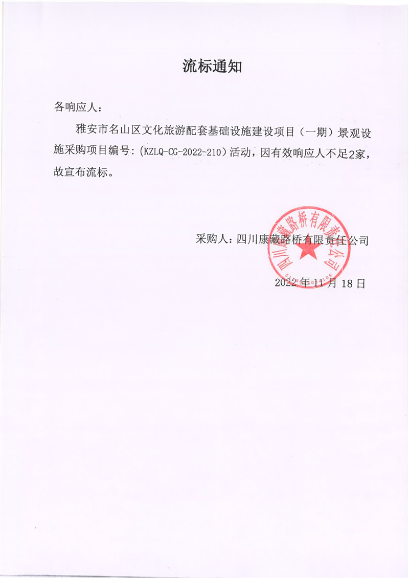 四川康藏路橋有限責(zé)任公司雅安市名山區(qū)文化旅游配套基礎(chǔ)設(shè)施建設(shè)項(xiàng)目(一期)景觀設(shè)施采購(gòu)項(xiàng)目流標(biāo)通知