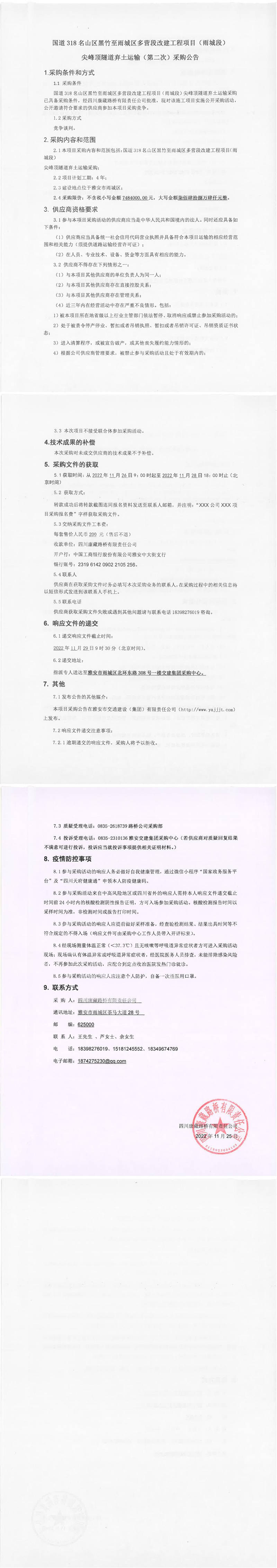 四川康藏路橋有限責(zé)任公司國道318名山區(qū)黑竹至雨城區(qū)多營段改建工程項目(雨城段)尖峰頂隧道棄土運(yùn)輸(第二次)采購公告