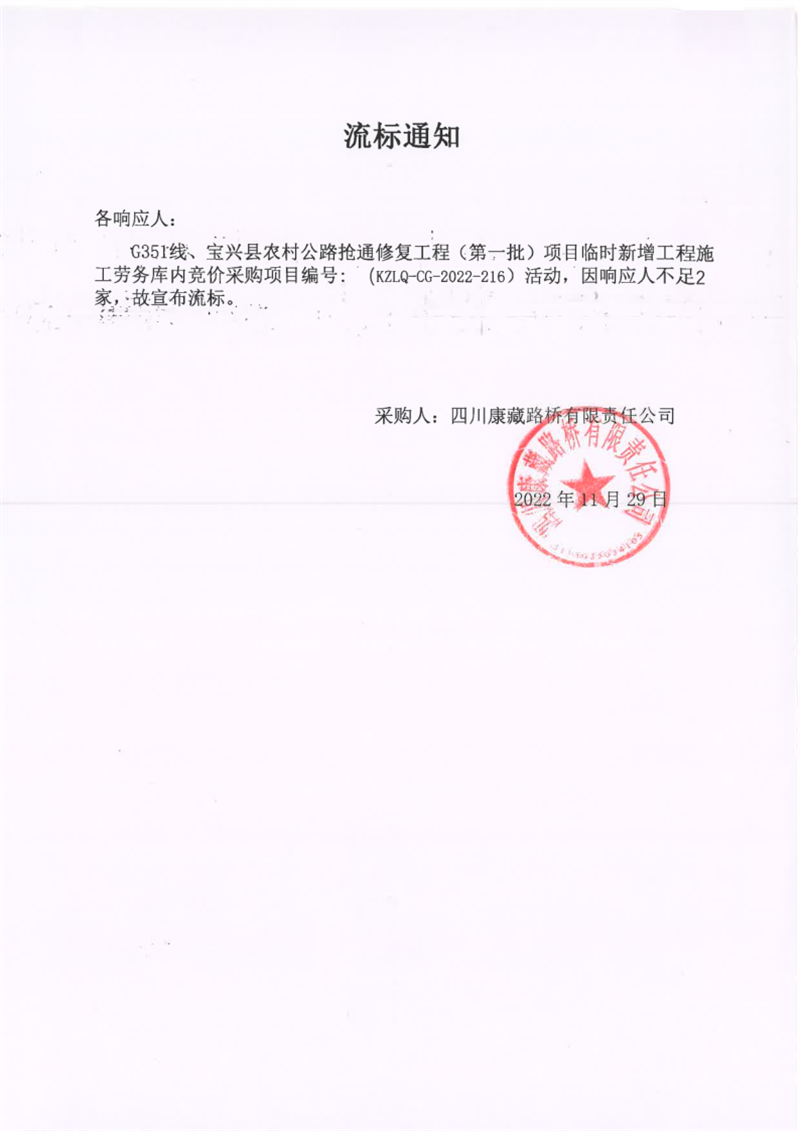 四川康藏路橋有限責(zé)任公司G351線、寶興縣農(nóng)村公路搶通修復(fù)工程(第一批)項(xiàng)目臨時(shí)新增工程施工勞務(wù)庫內(nèi)競價(jià)采購流標(biāo)通知