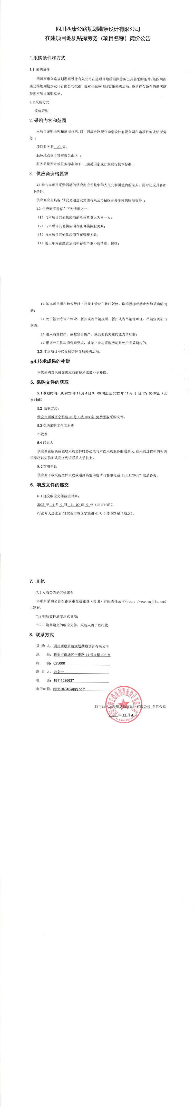 四川西康公路規(guī)劃勘察設計有限公司在建項目地質鉆探勞務(項目名稱)競價公告