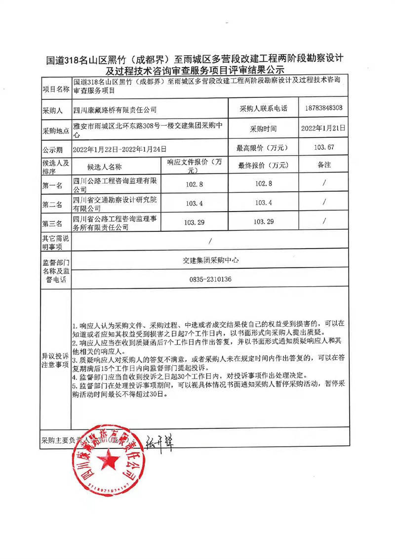 四川康藏路橋有限責(zé)任公司國(guó)道318名山區(qū)黑竹(成都界)至雨城區(qū)多營(yíng)段改建工程兩階段勘察設(shè)計(jì)及過(guò)程技術(shù)咨詢審查服務(wù)項(xiàng)目評(píng)審結(jié)果公示