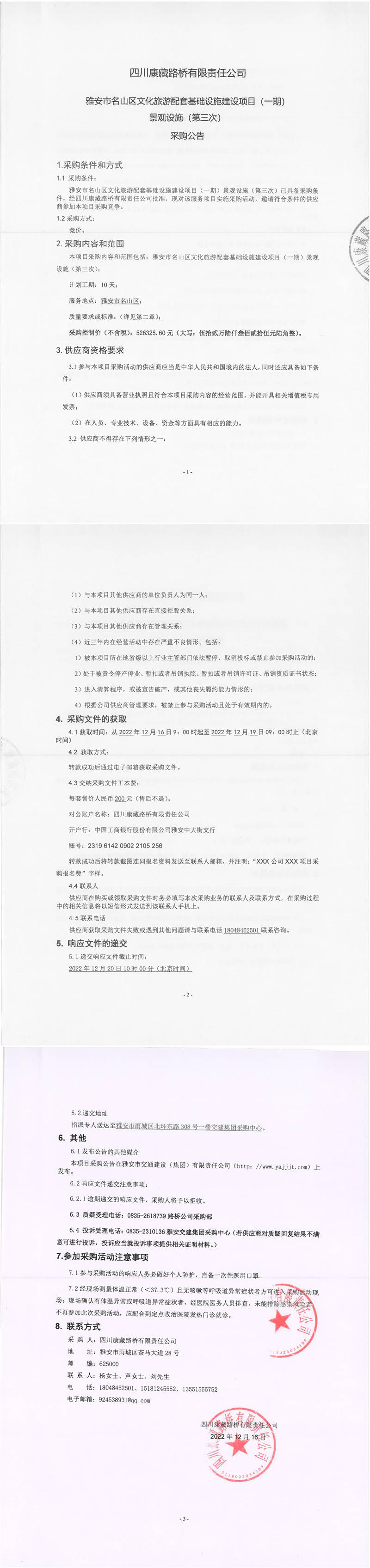 四川康藏路橋有限責任公司雅安市名山區(qū)文化旅游配套基礎設施建設項目(一期)景觀設施(第三次)采購公告