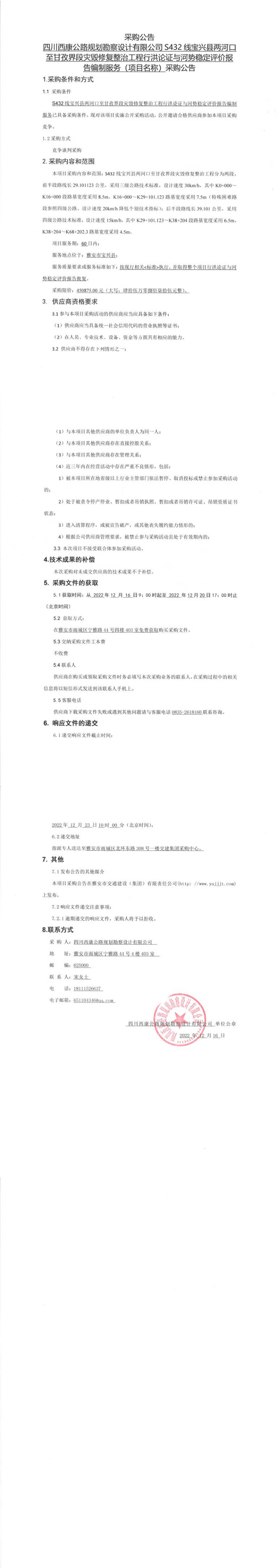 四川西康公路規(guī)劃勘察設(shè)計(jì)有限公司S432線寶興縣兩河口至甘孜界段災(zāi)毀修復(fù)整治工程行洪論證與河勢(shì)穩(wěn)定評(píng)價(jià)報(bào)告編制服務(wù)(項(xiàng)目名稱)采購公告