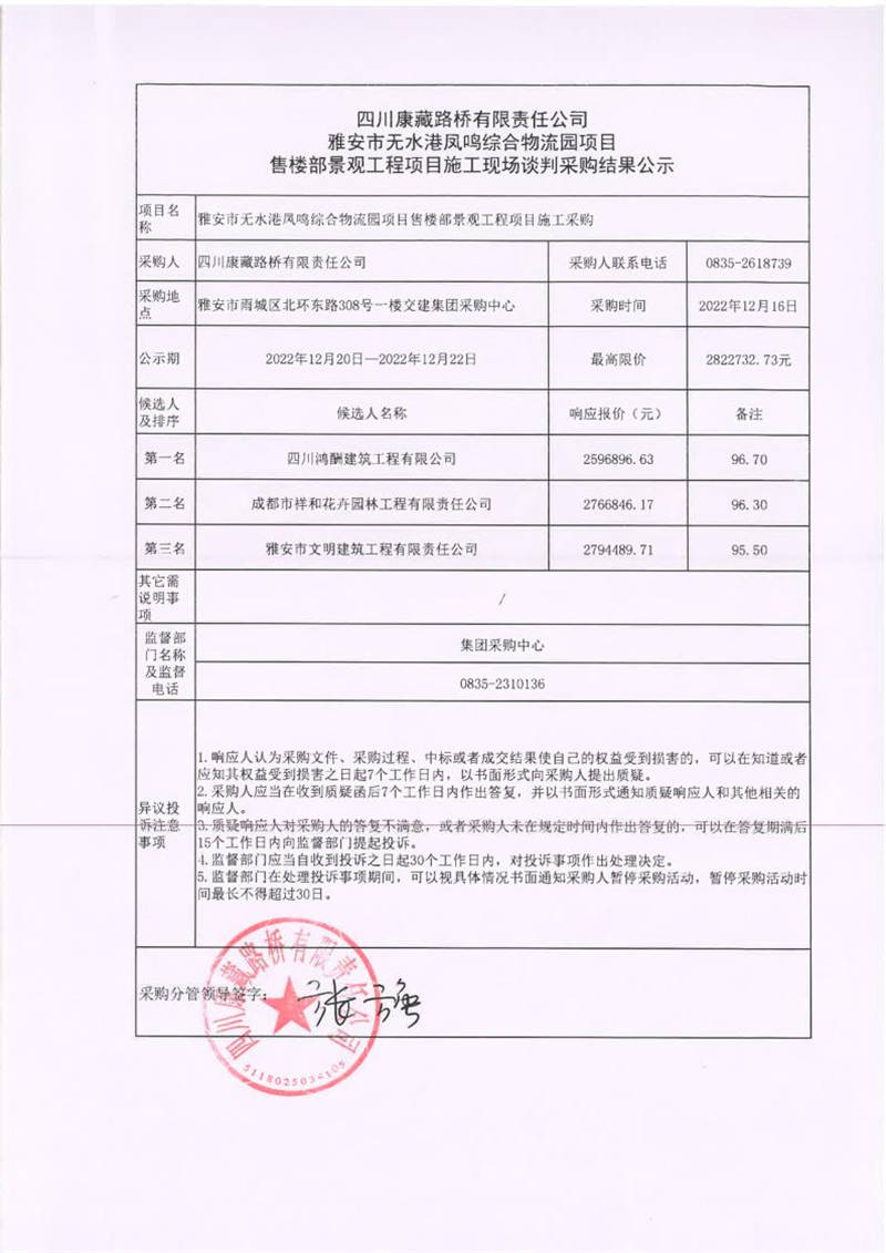 四川康藏路橋有限責(zé)任公司雅安市無(wú)水港鳳鳴綜合物流園項(xiàng)目售樓部景觀(guān)工程施工現(xiàn)場(chǎng)談判采購(gòu)結(jié)果公示