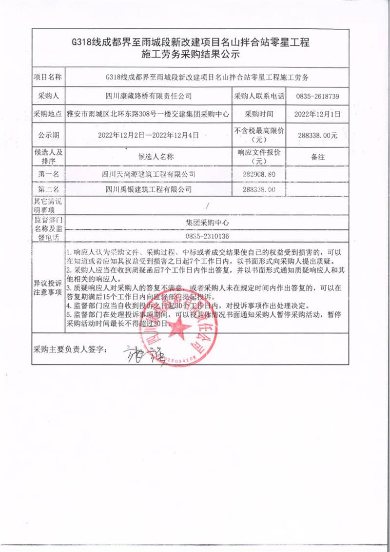 四川康藏路橋有限責任公司G318線成都界至雨城段新改建項目名山拌合站零星工程施工勞務采購結(jié)果公示