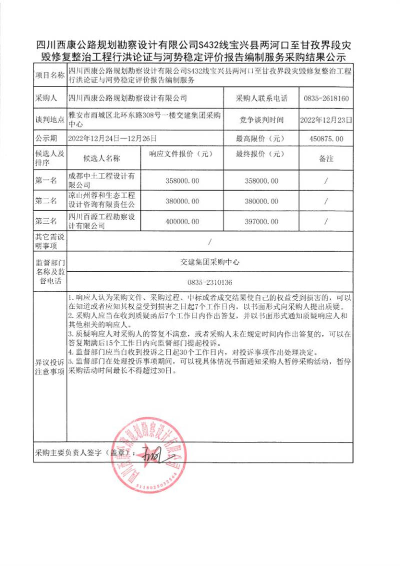 四川西康公路規(guī)劃勘察設(shè)計(jì)有限公司S432線寶興縣兩河口至甘孜界段災(zāi)毀修復(fù)整治工程行洪論證與河勢(shì)穩(wěn)定評(píng)價(jià)報(bào)告編制服務(wù)采購(gòu)結(jié)果公示