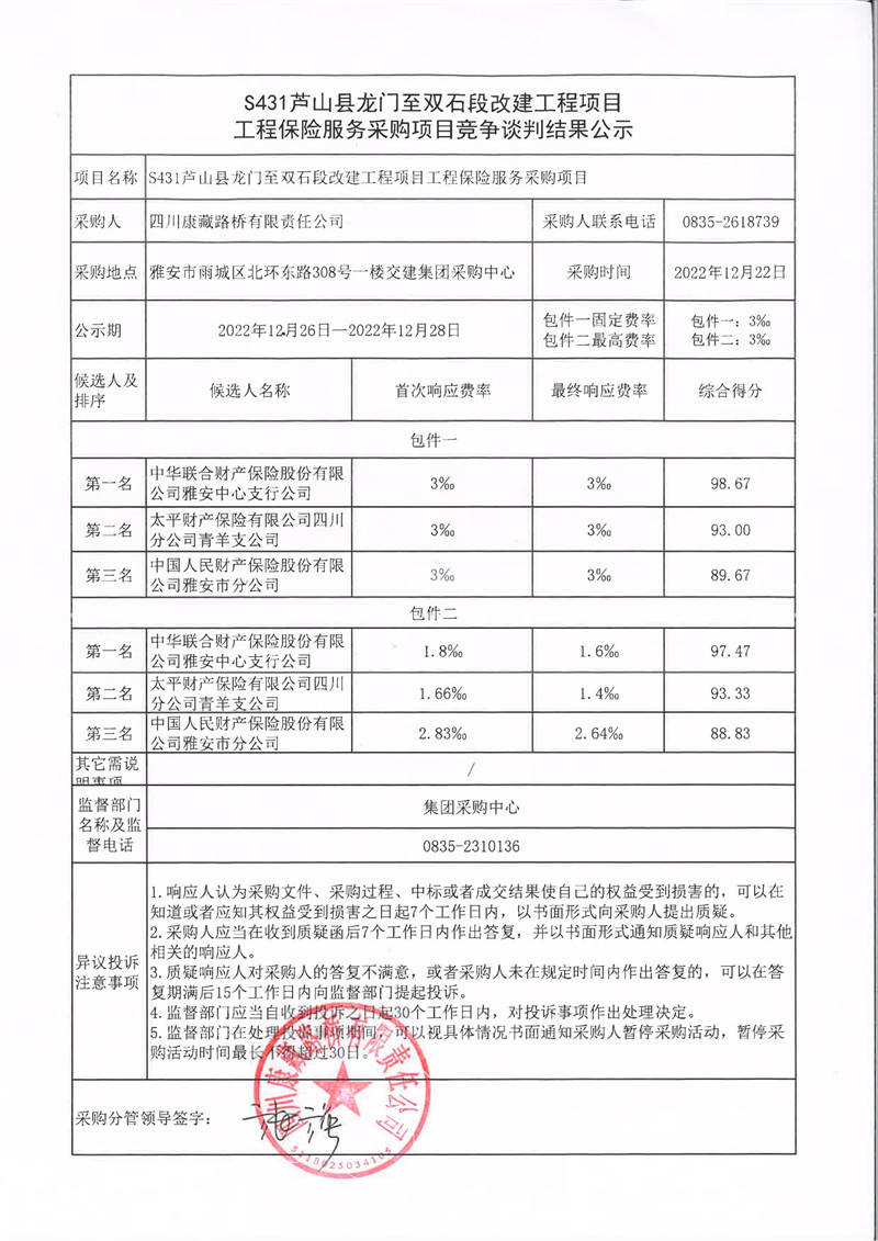 四川康藏路橋有限責(zé)任公司S431蘆山縣龍門(mén)至雙石段改建工程項(xiàng)目工程保險(xiǎn)服務(wù)采購(gòu)項(xiàng)目競(jìng)爭(zhēng)談判結(jié)果公示