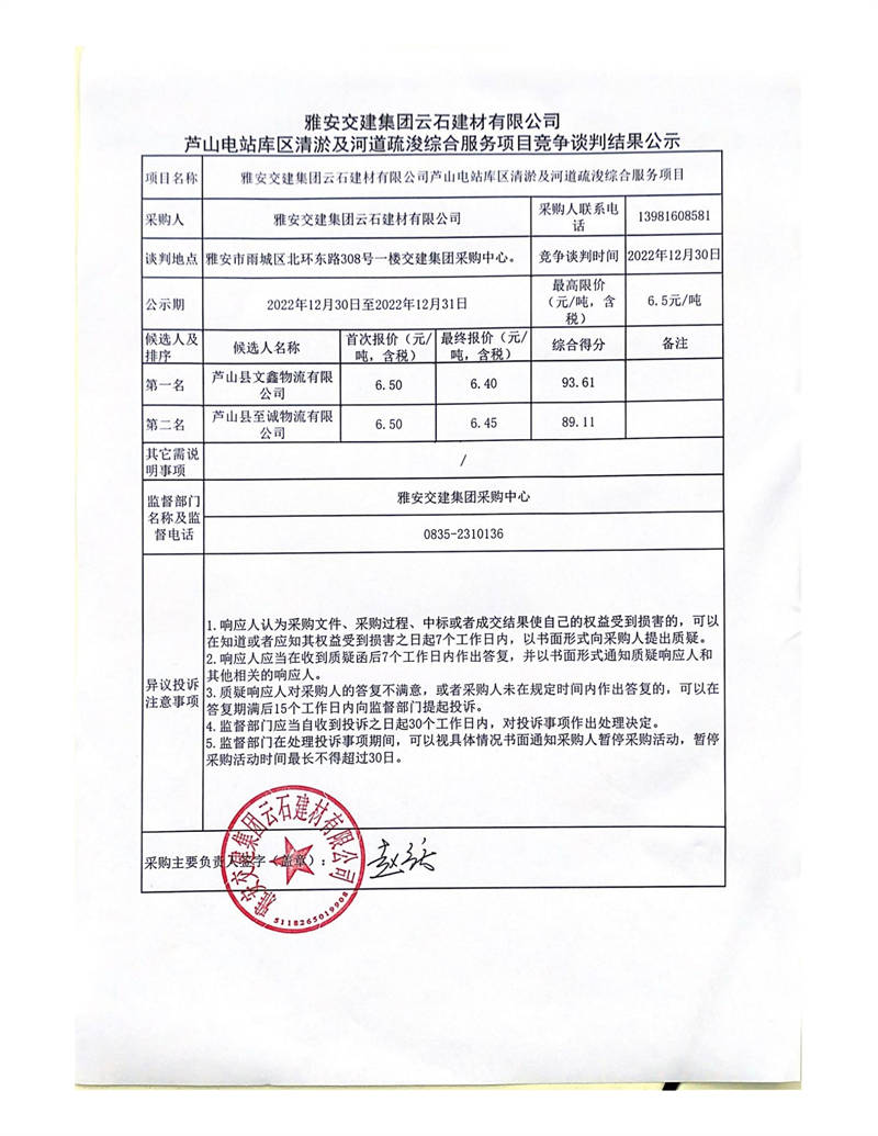 雅安交建集團(tuán)云石建材有限公司蘆山電站庫區(qū)清淤及河道疏浚綜合服務(wù)項(xiàng)目競爭談判結(jié)果公示