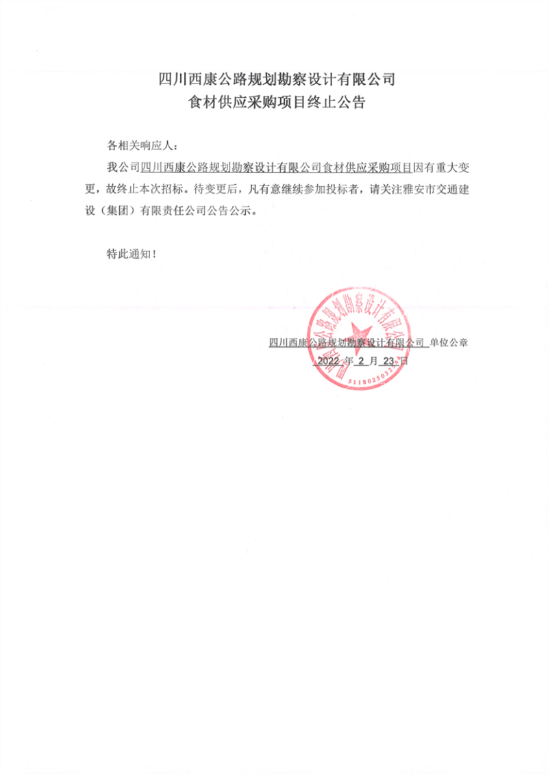 四川西康公路規(guī)劃勘察設(shè)計(jì)有限公司食材供應(yīng)采購項(xiàng)目終止公告