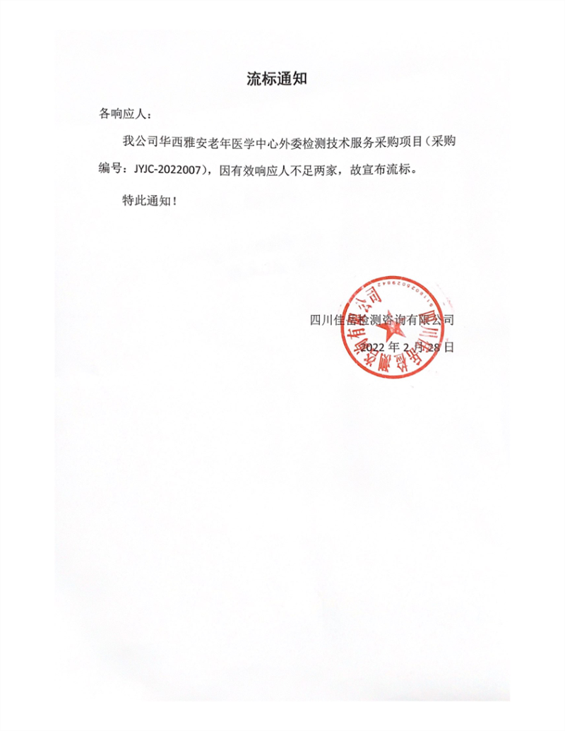 四川佳岳檢測咨詢有限公司華西雅安老年醫(yī)學中心外委檢測技術(shù)服務(wù)采購項目流標通知